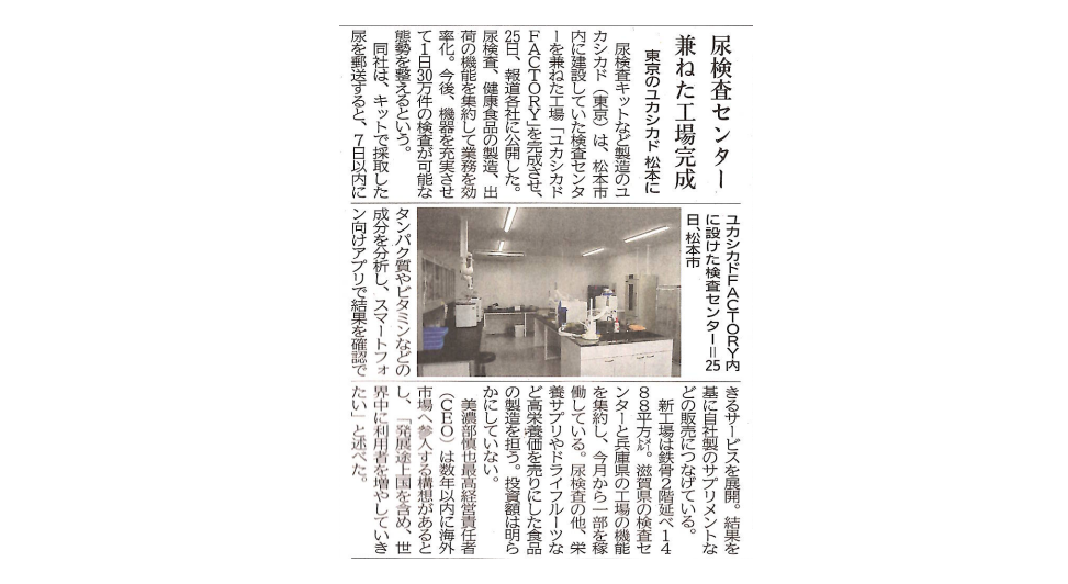 株式会社ユカシカド(代表取締役CEO:美濃部慎也、本社:東京都渋谷区)は、長野県松本市にパーソナライズに特化した自社検査センター&製造工場「ユカシカドFACTORY」の建設を進めて参りました。この度完